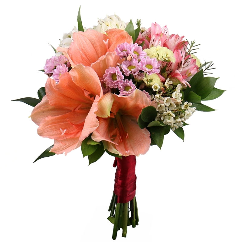 Букет состоит из 2 амариллиса, 4 ветки альстромерии, 2 ветки хризантемы, 2 ветки хамелациума, зелень, прозрачная упаковка, атласная лента.