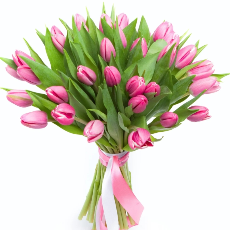 Букет состоит из 31 розовый тюльпан, прозрачная упаковка, атласная лента.