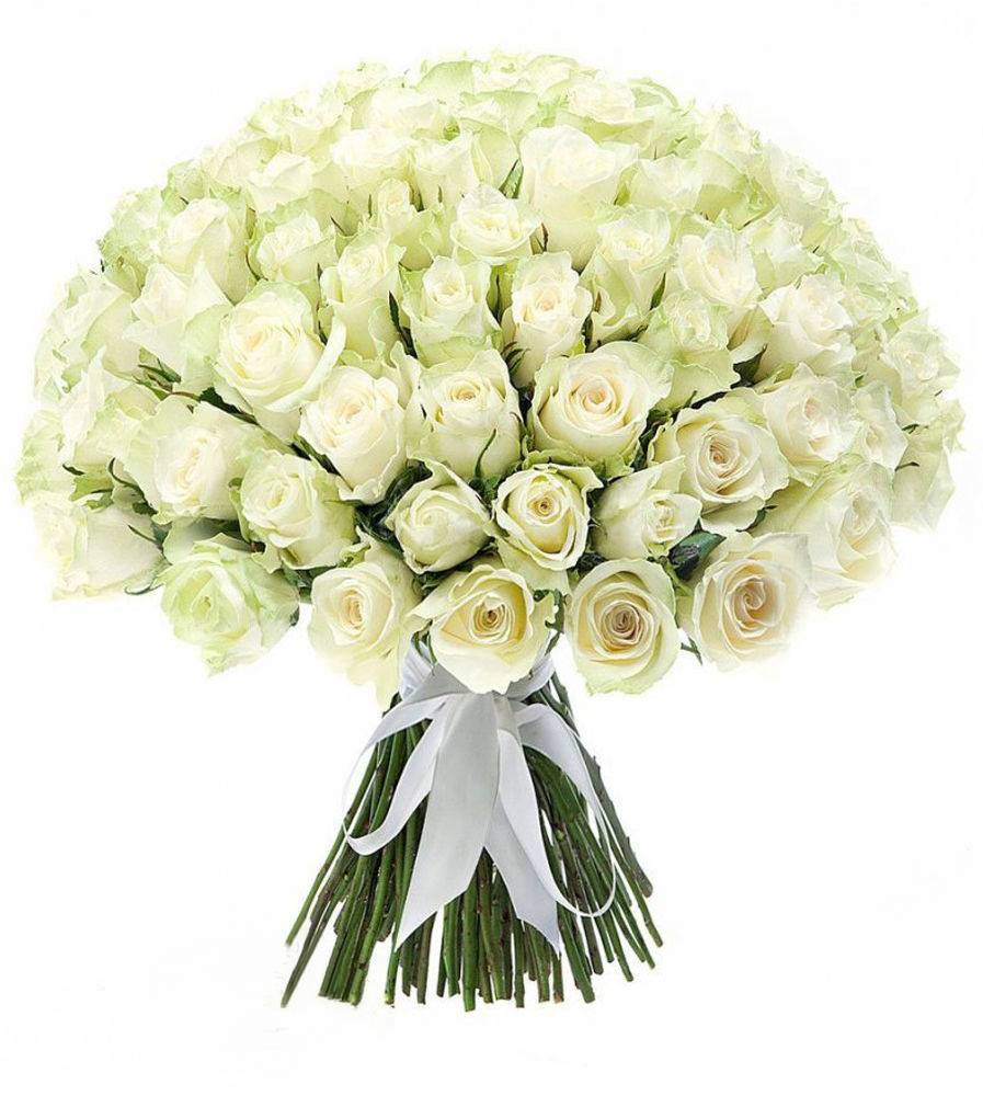 Букет состоит из 101 белая роза Кения, прозрачная упаковка, атласная лента.