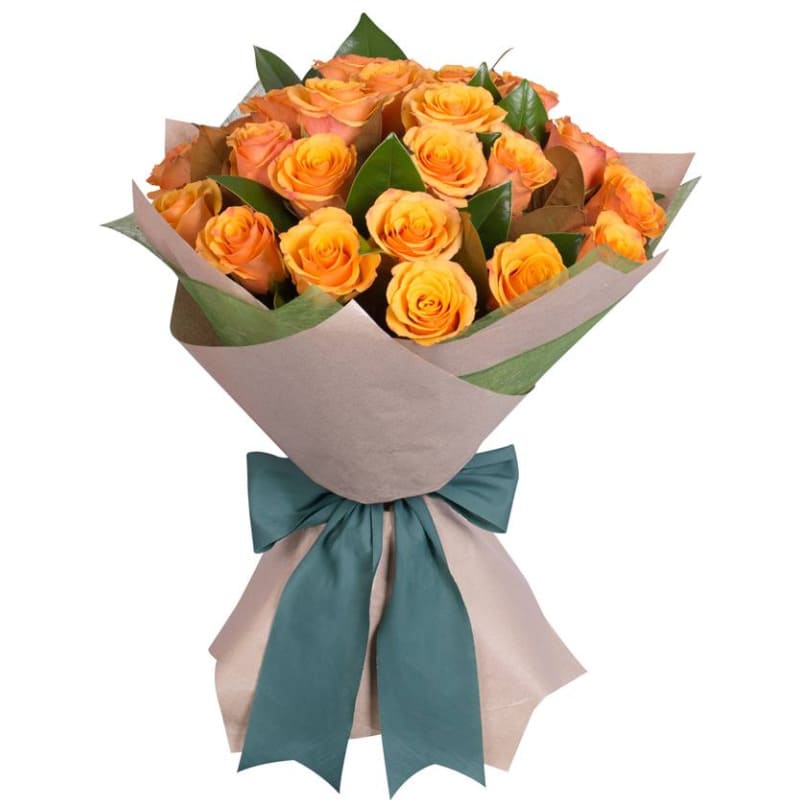 Букет состоит из 21 оранжевая роза, зелень, крафт, атласная лента.