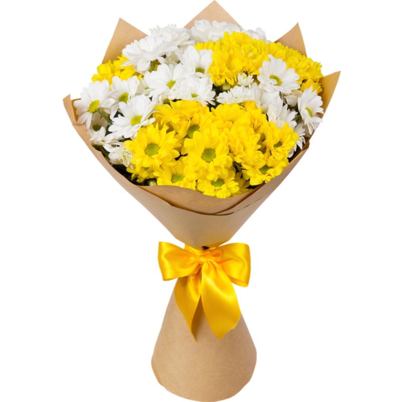 Букет состоит из 5 веток белой хризантемы, 4 ветки желтой хризантемы, крафт, атласная лента.