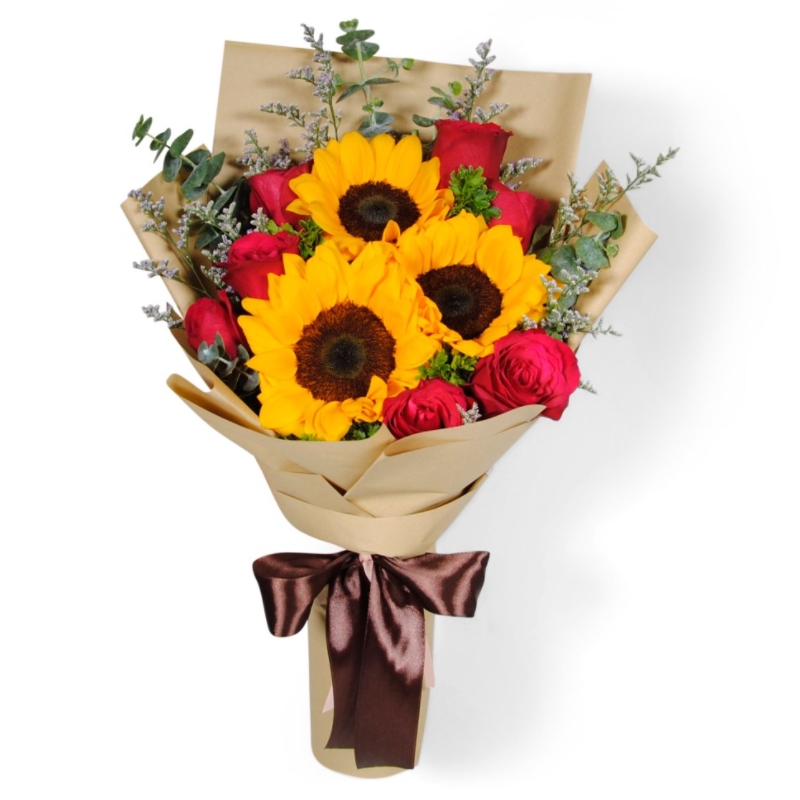 Букет состоит из 10 красных роз, 3 подсолнуха, декоративная зелень, крафт, атласная лента.