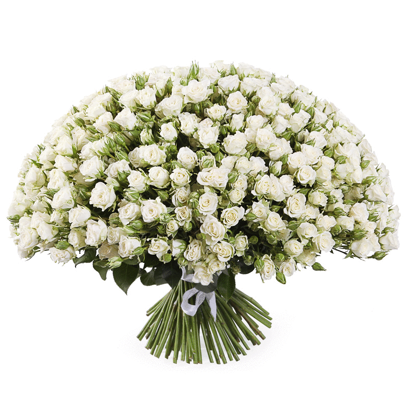 Букет состоит из 101 ветка белой кустовой розы, прозрачная упаковка, атласная лента.
