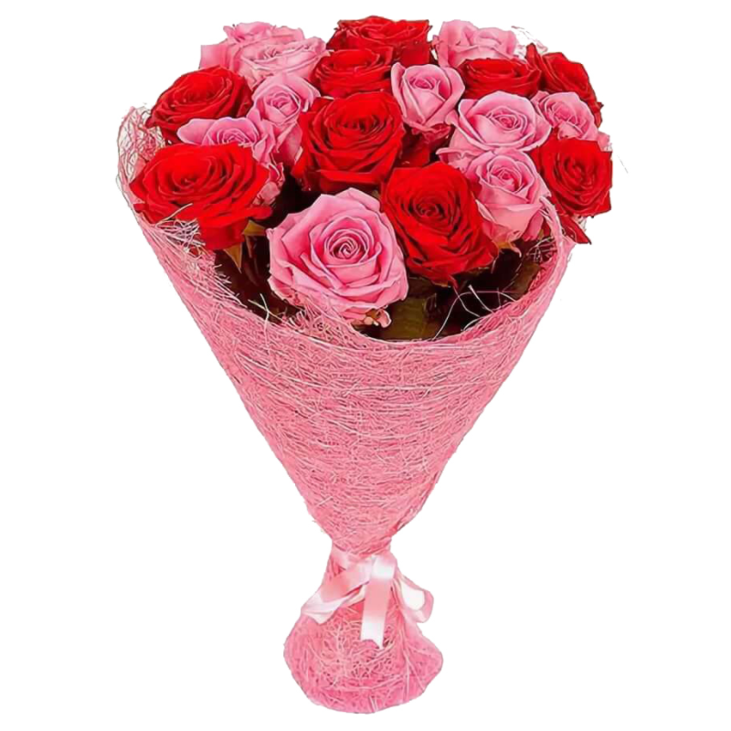 Букет состоит из 11 розовых роз, 10 красных роз, красивая упаковка, атласная лента.